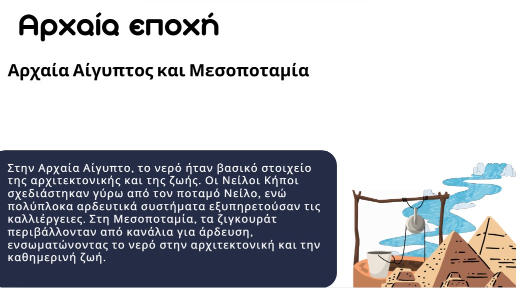 Γ1 ΓυμνασίουΤα παιδιά της Γ΄ τάξης του Γυμνασίου μας ανακαλύπτουν με ποιο τρόπο οι υδάτινοι δρόμοι, όπως τα ποτάμια, ο λίμνες και οι πηγές γλυκού νερού, διαμόρφωσαν την ιστορία μας και καθόρισαν την ανάπτυξη του πολιτισμού. Χρησιμοποιώντας την εφαρμογή Storymaps, τα παιδιά σχεδιάζουν υδάτινες διαδρομές που όρισαν τους πρώτους πολιτισμούς όπως ο Νείλος και ο Αμαζόνιος. Παράλληλα με την βοήθεια της τεχνολογίας στην αποτύπωση των υδάτινων δρόμων, τα παιδιά έκαναν έρευνα και αποτύπωσαν τα ευρήματά τους παράγοντας πρωτότυπα κείμενα. Στις 5 Απριλίου σας περιμένουν με ενθουσιασμό να σας παρουσιάσουν το πρωτότυπο project τους.